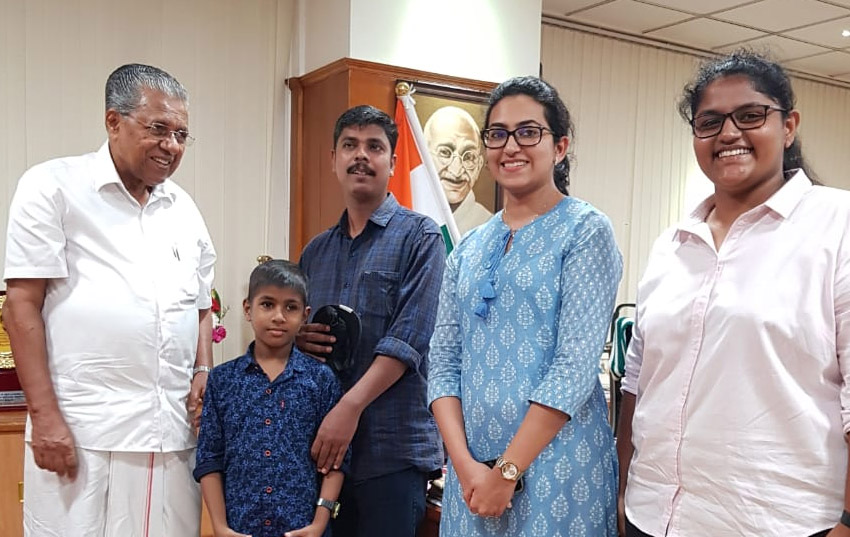 Finally Albin has his wish fulfilled. In between his very busy schedule, our Hon:chief minister Shri Pinarayi Vijayan cut in his time to spend time with Albin. Albin receiving a box of sweets from the CM with his father and alongside are Reach CEO Sara Raunaq Mathew and Roshna Grace Mathew. Reach World Wide thanks our CM Shri Pinarayi Vijayan for his kind gesture.