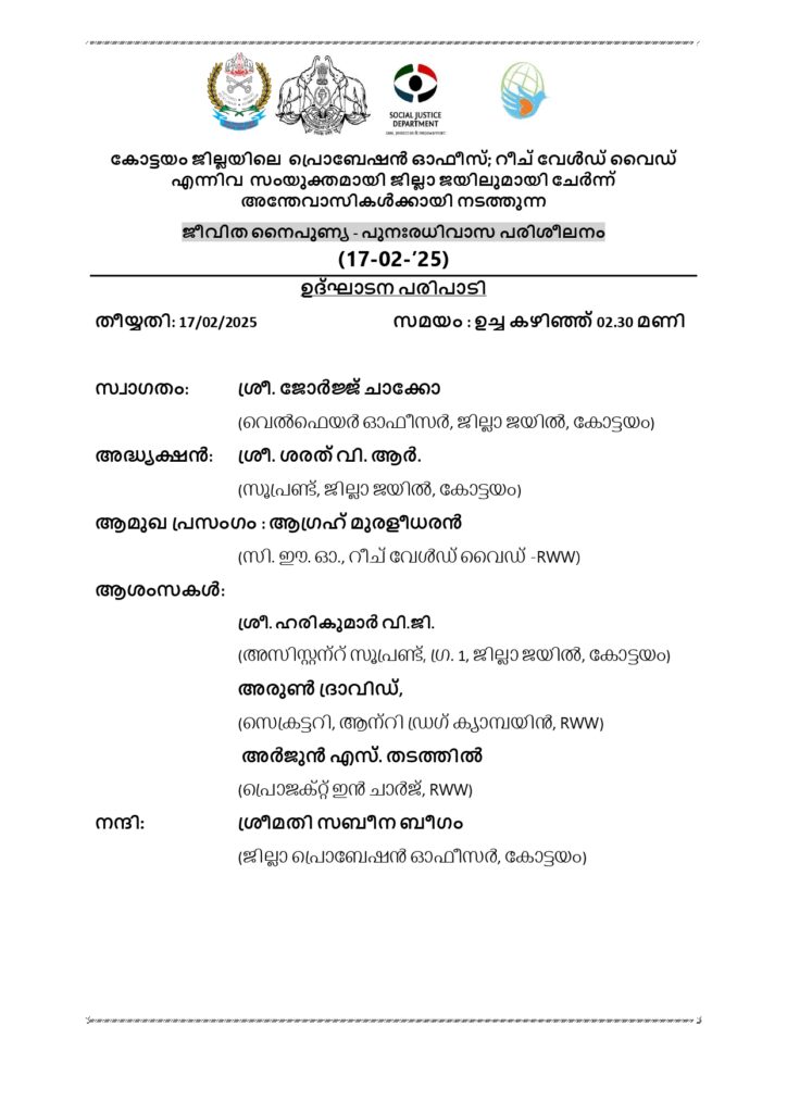 Reach World Wide, in collaboration with the Social Justice Department, Kerala and the District Probation Office, Kottayam, conducted a powerful motivational training session at Kottayam District Jail. The session was attended by around 70 prisoners, aiming to inspire hope, transformation, and a fresh start.